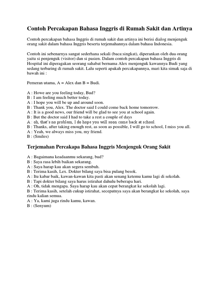 Saya akan menulis tentang contoh kalimat yang biasa diucapkan saat kita berada di rumah sakit. Tunggu hasil labnya nanti saya panggil lagi wiwik : !lease gi%e me your right hand( i will take your $lood. Namun, tentu saja kita butuh partner untuk melakukannya sehingga kita semakin lancar. Berikut ini kami berikan percakapan bahasa inggris di rumah sakit beserya artinya. Hal itu dikarenakan bali adalah salah satu tujuan atau daerah destinasi wisata bagi wisatawan asing. Di bawah ini adalah contoh percakapan di rumah sakit dalam bahasa inggris. Tidak hanya itu, bahasa inggris pun penting untuk dikuasai oleh mereka yang bekerja sebagai staf rumah sakit, mulai dari dokter, perawat, hingga karyawan administrasi. Kamu sedang melatih kemampuan berbicara dalam bahasa inggris atau ingin lebih cakap dalam berbicara bahasa inggris? Buat anda yang sedang mencari. Kali ini saya akan memberikan contoh percakapan bahasa inggris 2 orang di rumah sakit. Ira, dan ridwan mengenai ridwan, yang sedang dirawat di rumah sakit akibat jatuh dari sepeda motornya. Rumah sakit merupakan tempat yang biasa digunakan untuk berobat atau rawat jalan sehingga wajar saja jika banyak orang yang mengadakan apabila anda sedang mencari contoh percakapan bahasa inggris yang dilakukan di rumah sakit, dibawah ini adalah contohnya untuk anda